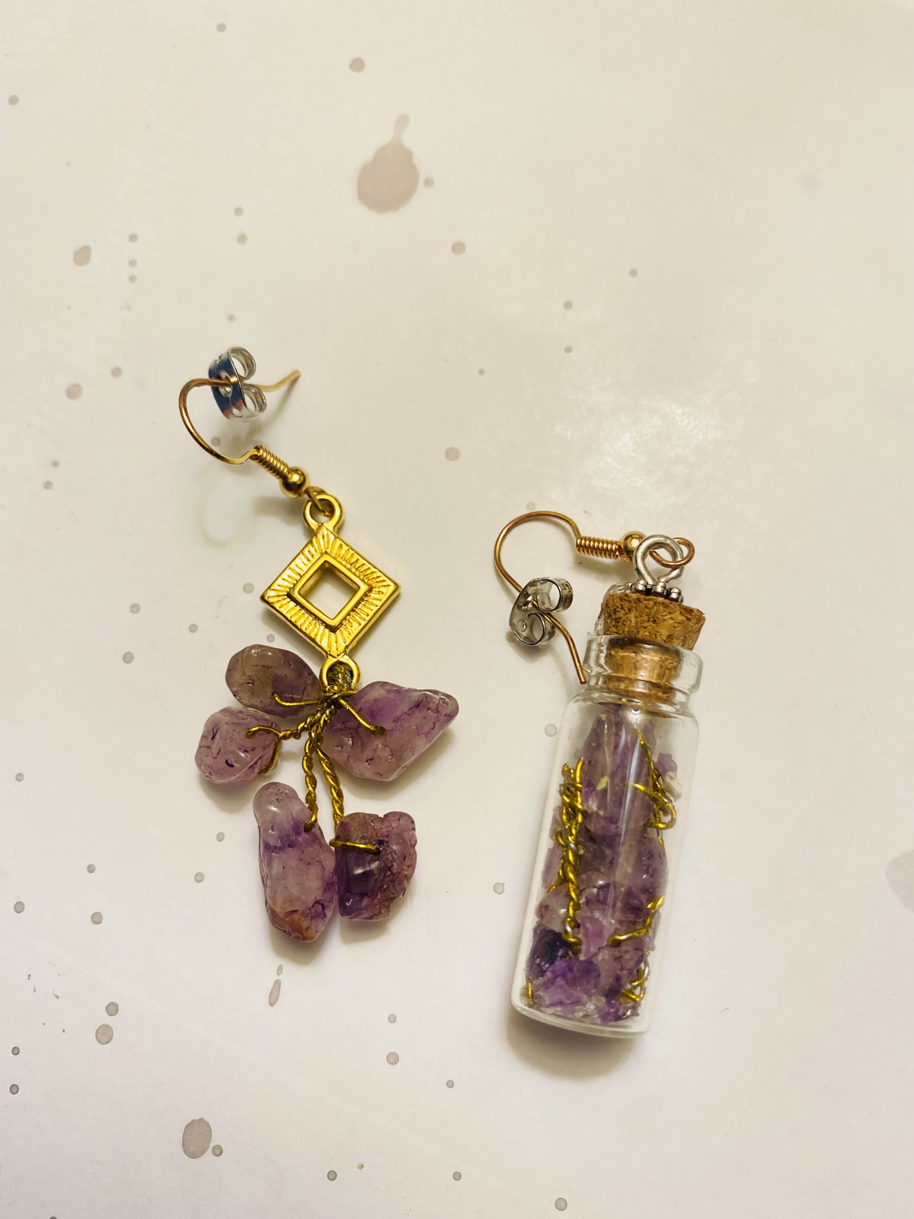 i've made a few pieces of jewelry before and i think these are probably my second favorite earrings. the amethyst ones on the right are definitely my top favorite! i bought a tiny tree whose trunk/branches were made of braided gold wire, with tiny decorative amethyst leaves, and i broke that down and turned it into these sick earrings. but unfortunately all good things must come to an end, and when i was on vacation in Las Vegas i dropped the glass earring and it shattered :(